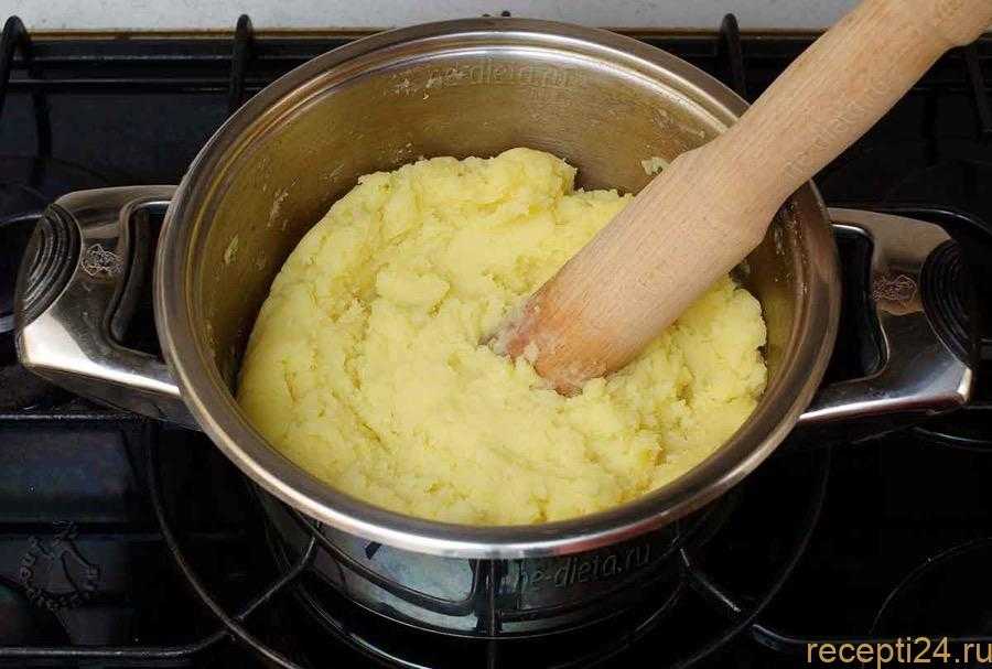 5) Размять картофель металлической или деревянной картофелемялкой до состояния пюре. Делайте это очень энергично и очень тщательно в течение 4-5 минут, чтобы разбить все комочки и получить нежнейшее картофельное пюре.