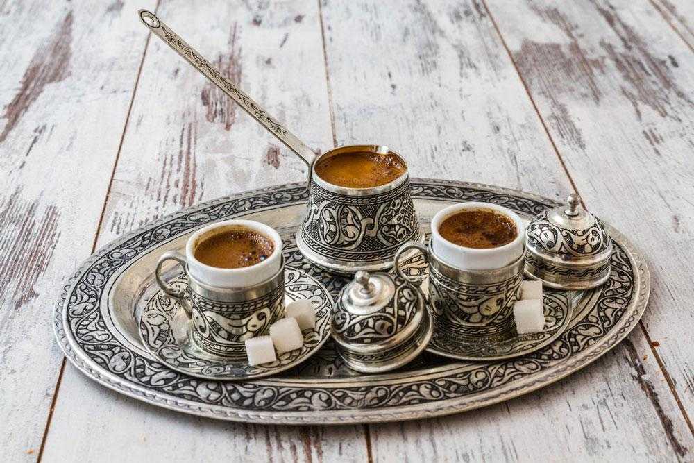 Прожаренные зернышки растирали, используя деревянные ступки, в мельчайший порошок, напоминающий пыль. Необходимое количество кофе заливали в турке холодной водой, ставили на слабый огонь – напиток должен не кипеть, а слегка томиться. Приготовленную ароматную жидкость переливали в большую глиняную емкость, немного настаивали, разливали по маленьким чашечкам, сразу подавали к столу.