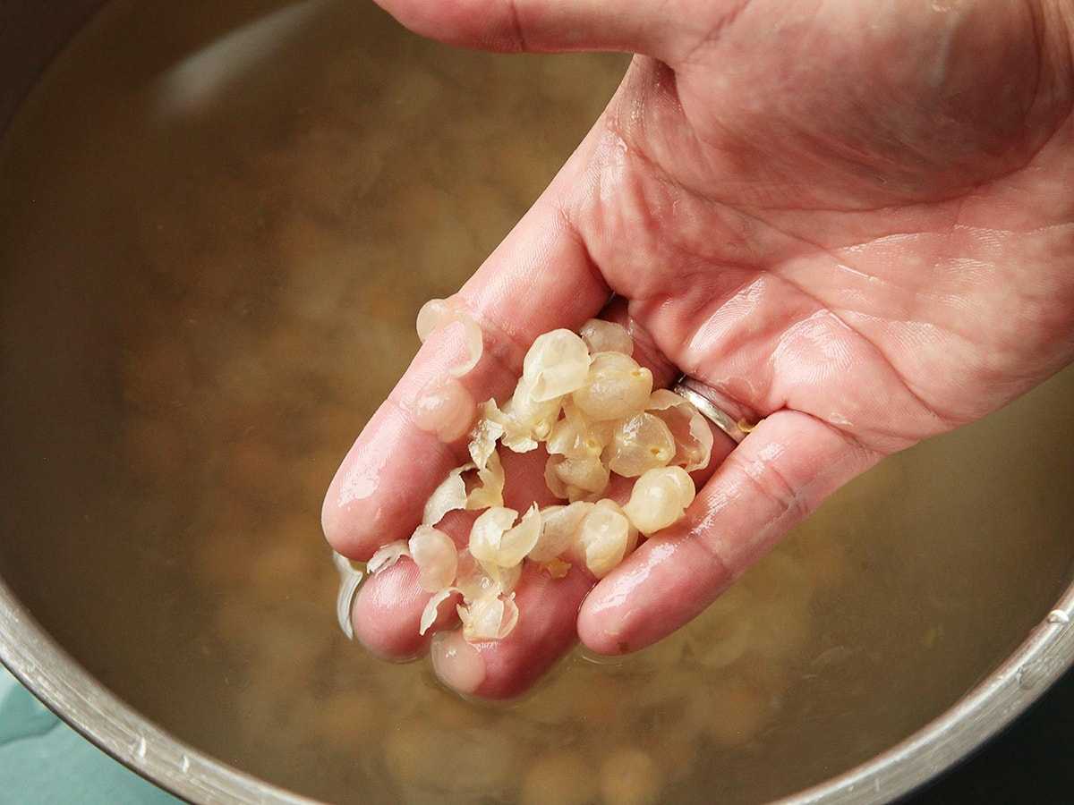 Несмотря на то, что внешняя оболочка у нута не такая жесткая, как у гороха, в некоторых рецептах бобы всё же рекомендуют очистить. Процесс это довольно длительный, так как всё делается вручную.