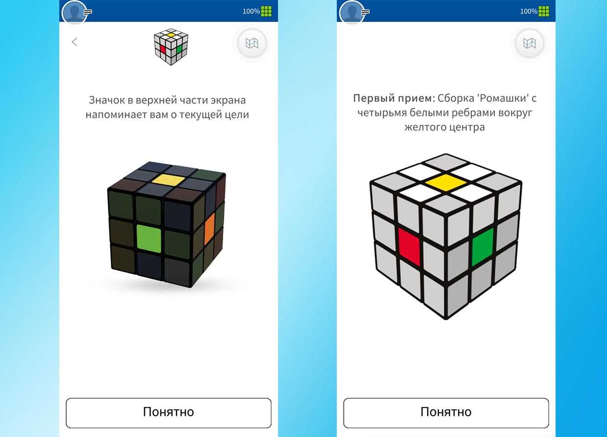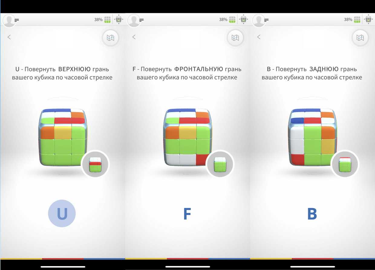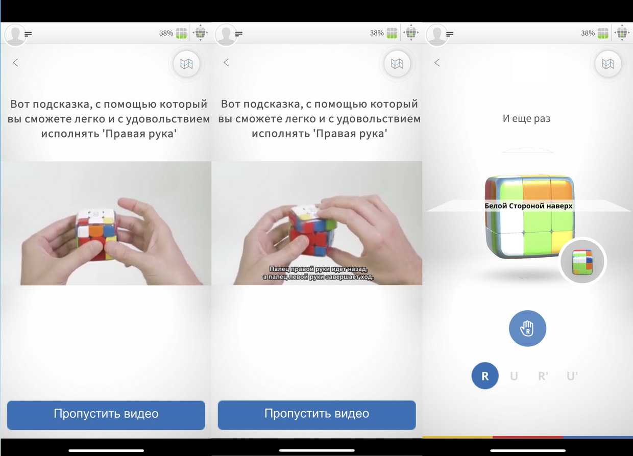 Приложение последовательно учит вас основам игры с кубиком Рубика: