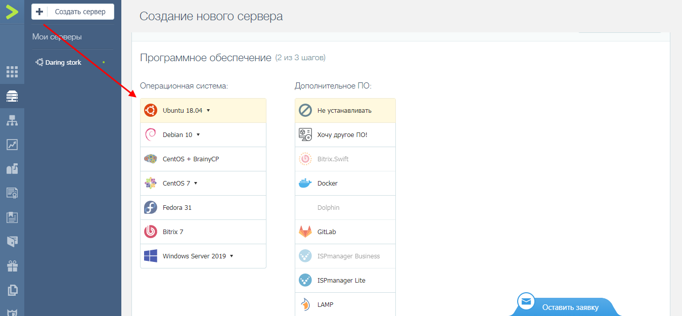 Выбираем тип операционной системы, нам подойдет Ubuntu 18.04. Дополнительное программное обеспечение ставить не нужно, поэтому оставляем отметку «Не устанавливать». Внизу жмем «Далее».