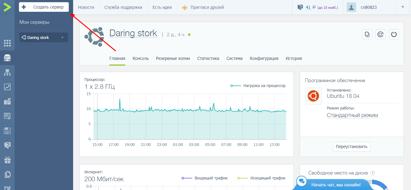 Теперь мы можем создать VDS: в верхнем левом углу выбираем «Создать сервер».