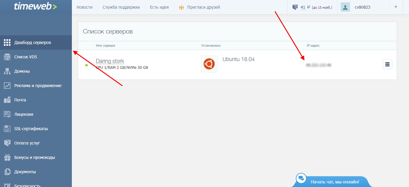 Следующим шагом нам потребуется узнать IP адрес VDS: открываем личный кабинет на хостинге и переходим в раздел «Дашборд» – в нем обращаем внимание на соответствующий столбик и копируем из него адрес.