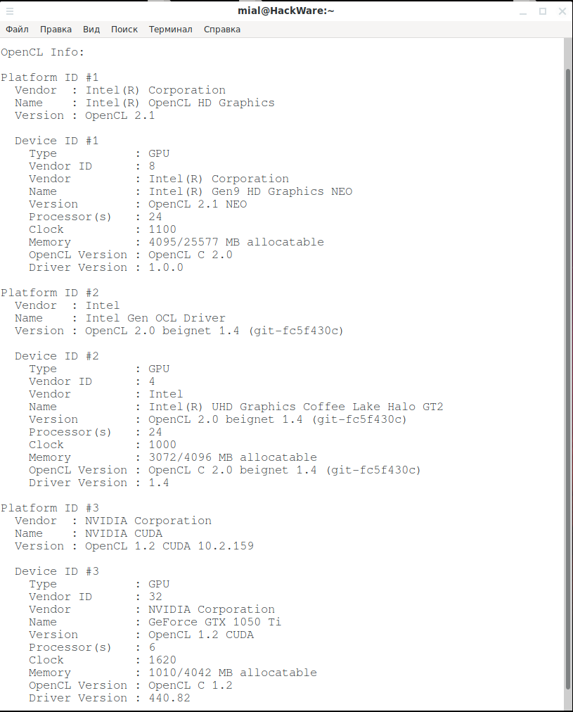 beignet — это реализация OpenCL для Intel IvyBridge и Haswell iGPUs. В настоящее время этот пакет считается устаревшим и его должен заменить intel-compute-runtime. У меня в системе установить beignet, то появляется дополнительное устройство OpenCL — как на Kali Linux, где также видно 3 устройства OpenCL. Но это устройство работает нестабильно с Hashcat.