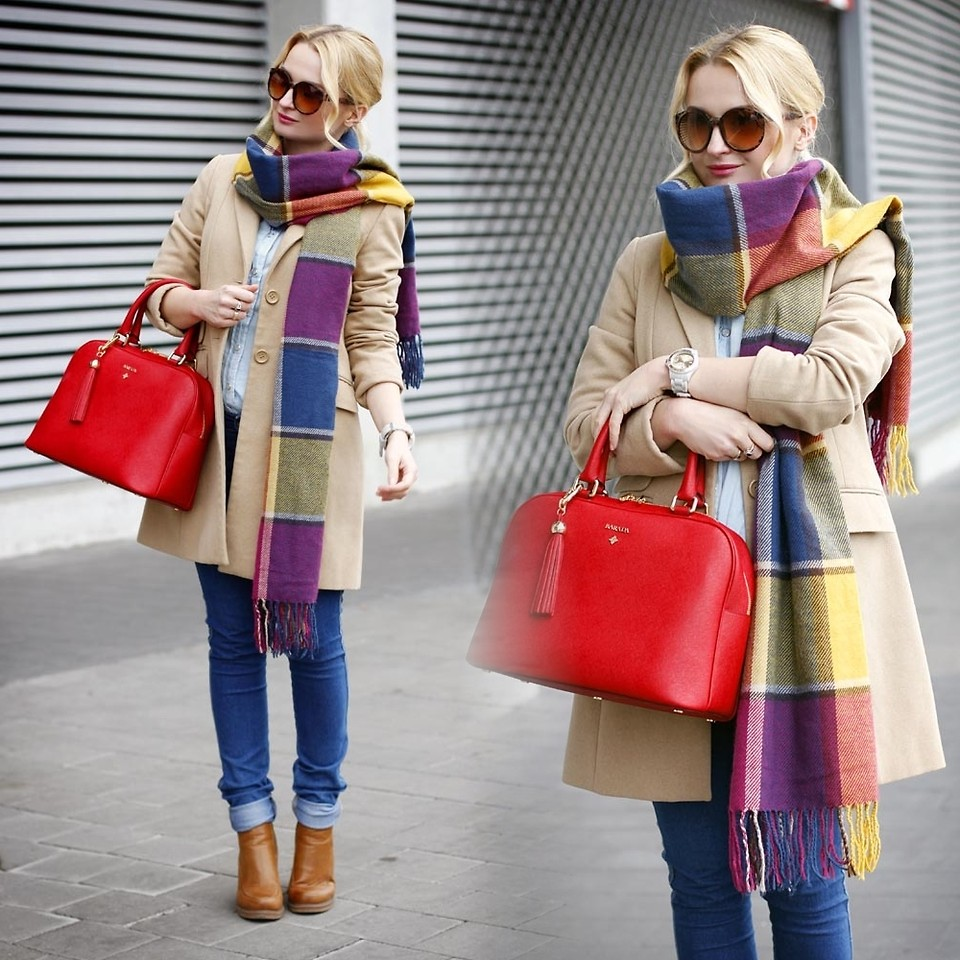 Кобальтово-синяя сумка подойдет, если носите много холодных цветов, таких как серый, лавандовый. Сумка цвета бархатцев будет отличным выбором, если любите коричневый и теплые тона.