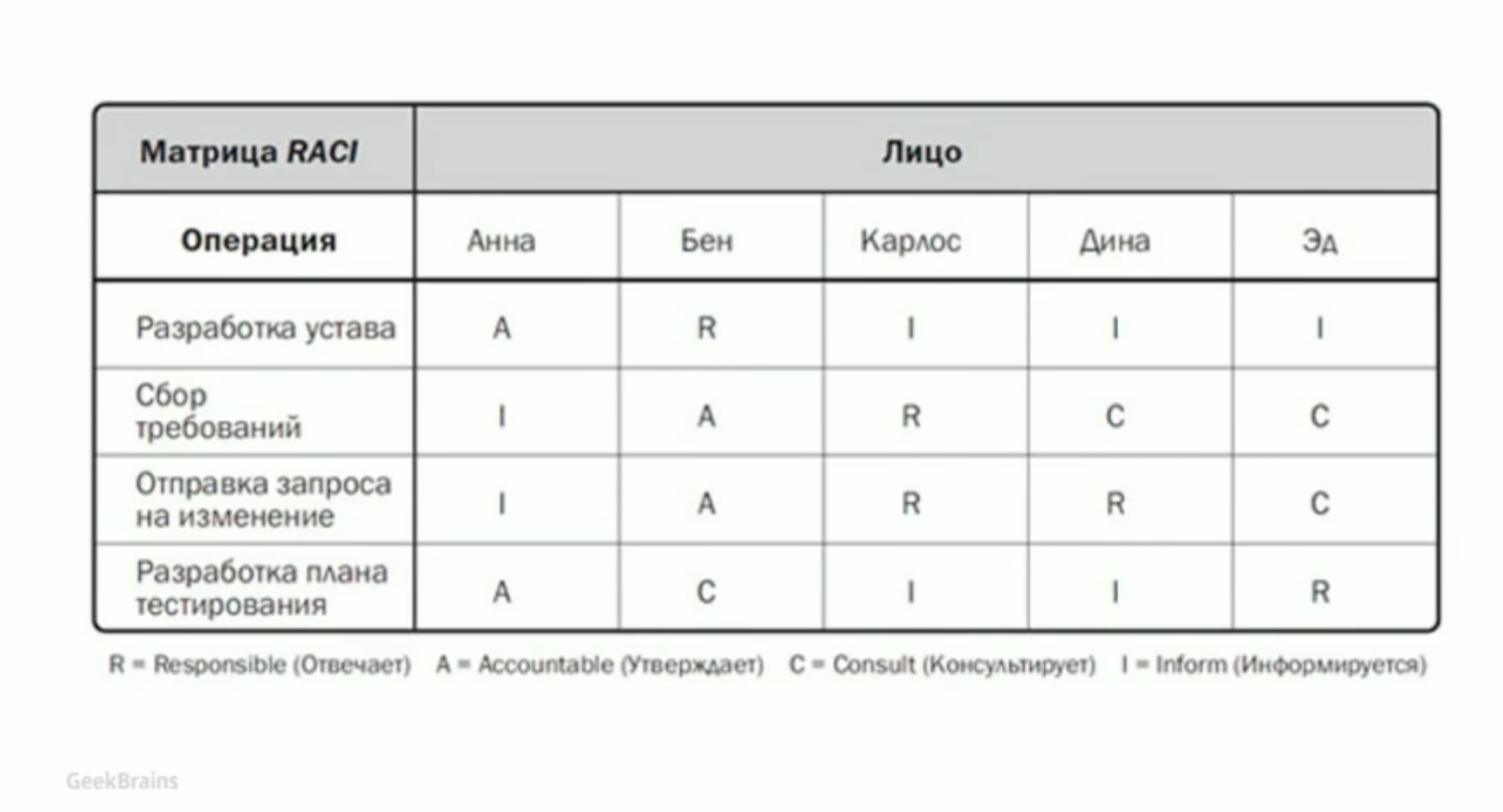 В матрице выделяется четыре зоны ответственности: R — responsible (исполняет), A — accountable (несёт ответственность) C — consult before doing (консультирует до исполнения), I — inform after doing (оповещает после исполнения). Рассмотрим это на примере.