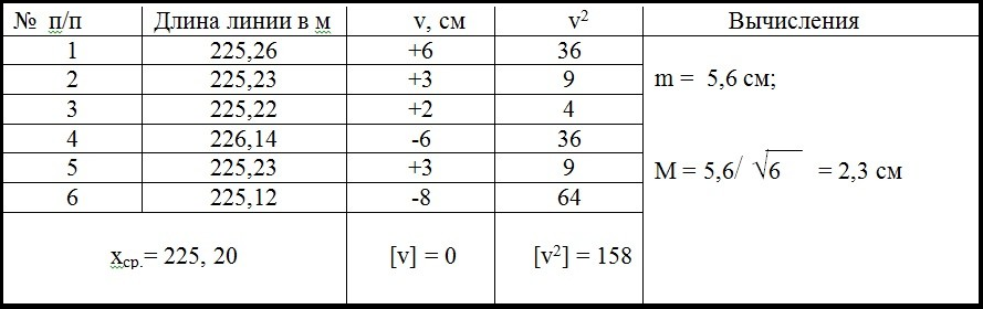 значения арифметической средины. Контроль вычислений:  = 0;_______3. По формуле вычисляют среднюю квадратическую ошибку одного измерения._______4. По формуле вычисляют среднюю квадратическую ошибку арифметической