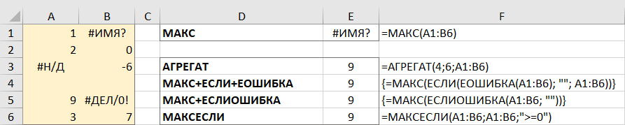 Число 4 в первом аргументе предписывает выполнить поиск максимального числа, шестёрка во втором аргументе – это параметр «игнорировать ошибки», а A1: B6 — ваш целевой диапазон.