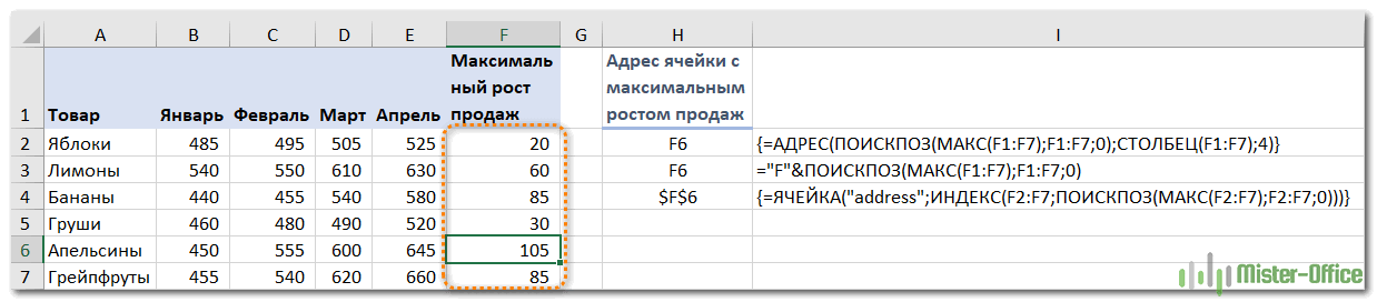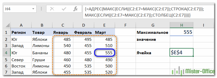 А вот еще альтернативные варианты поиска адреса наибольшего числа по столбцу, из которых вы можете выбрать наиболее подходящий для себя:
