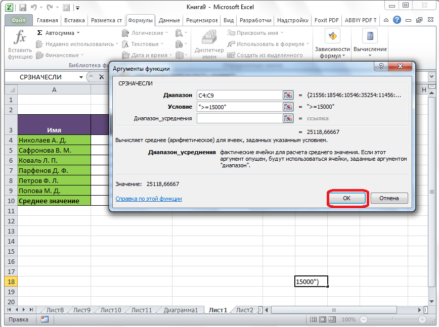 После этого, в предварительно выбранную ячейку выводится результат расчета среднего арифметического числа для выбранного диапазона, за исключением ячеек, данные которых не отвечают условиям.