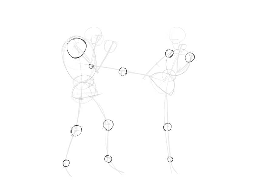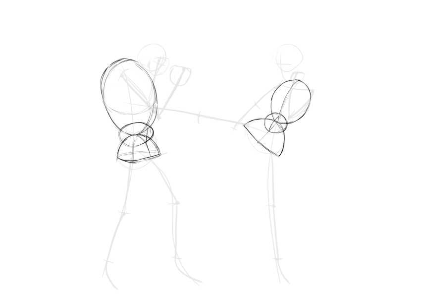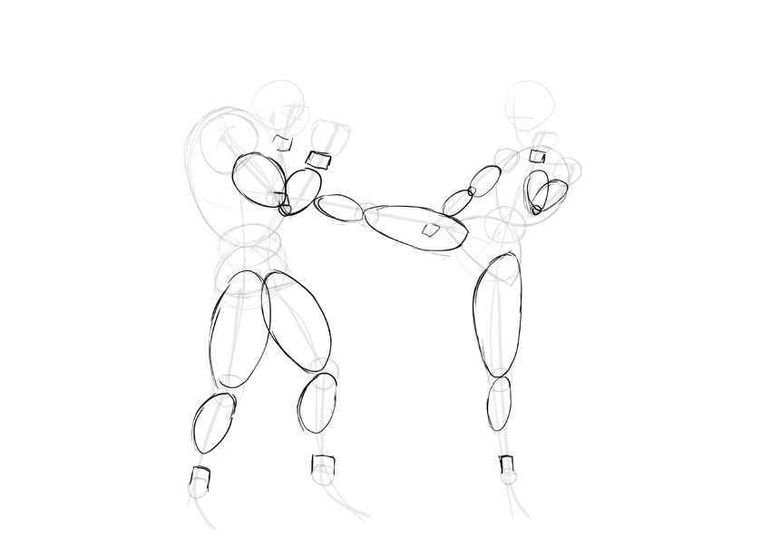 Теперь перейдем к практике. Для начала рисуем туловище. Внимательно подгоните перспективу под позы бойцов. В аниме такие динамические позы редко рисуют в обычном виде спереди или сбоку.