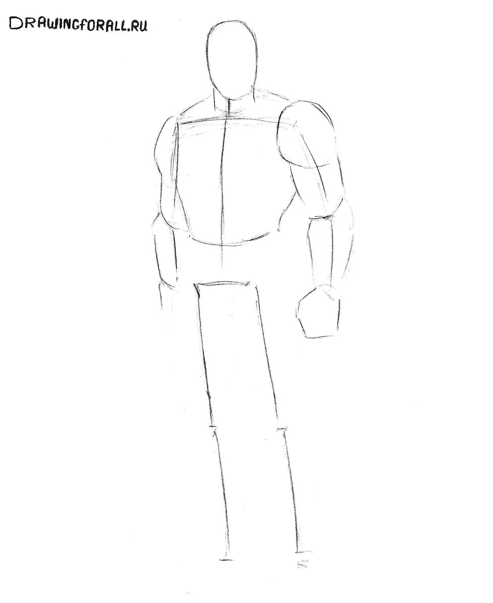 Посему шар дельтовидной мышцы плеча будет ещё больше, предплечья — массивнее, впрочем, как и все руки в целом. Парой плавных линий обозначьте торс, соедините его с головой, нарисуйте шею, набросьте кулаки и переходите к следующему этапу.