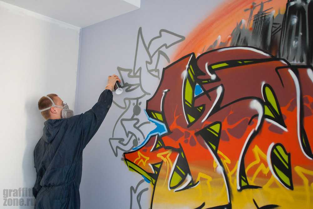 В обыденном понимании граффити рисунок это обязательно аэрозоль, но на самом деле это не так. Спрей-краска это только инструмент. Граффити это яркое уличное искусство, которое можно сделать чем угодно. Почти такой же рисунок можно сделать водными красками, нанесёнными с помощью кисти и валика. Контур сделать широкими акриловыми граффити маркерами. При этом не будет ни вредного запаха ни запыливания комнаты.