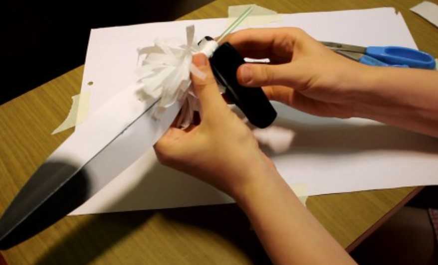 Для изготовления перьев пойдут коктейльные трубочки (которые надо разрезать вдоль) и разноцветная креп-бумага. Ее надо нарезать прямоугольниками размером 22х5 см, а потом закруглить края и сделать по ним много надрезов. Лучше всего для закрепления бумажного «пуха» на коктейльных трубочках воспользоваться салфеткой, которую прикрепим скотчем.