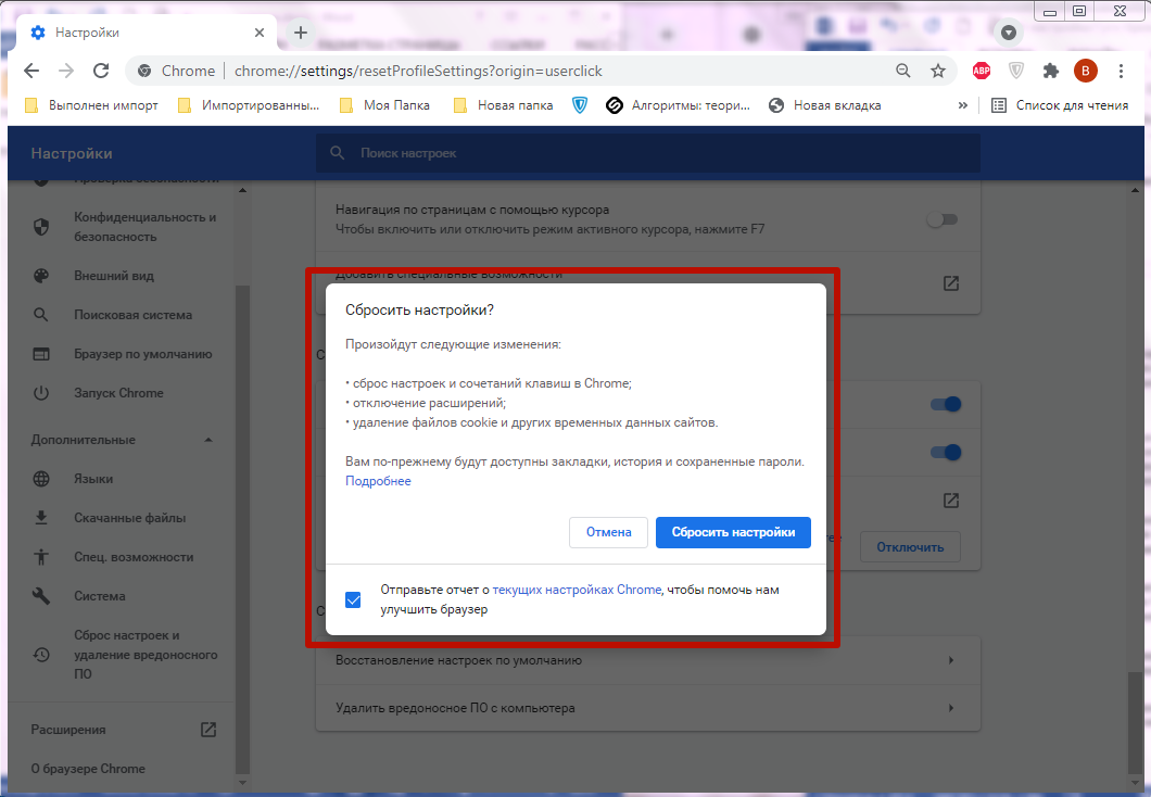 При выполнении команды «Восстановление настроек по умолчанию» происходит сброс всех параметров к изначальному значению, а все активные расширения отключаются. При этом закладки, журнал посещений, пароли и другие данные сохраняются.