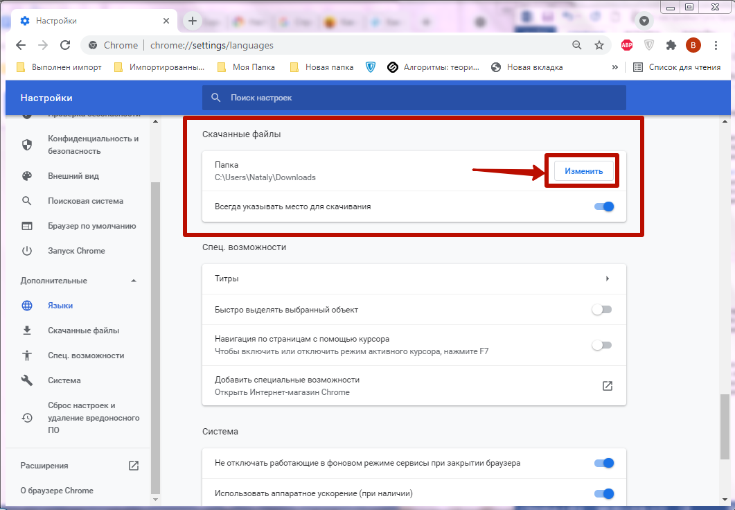 В Хром можно вручную указать папку, в которой находятся загруженные файлы. По умолчанию это C:\Users\User_Name\Downloads», но при необходимости можно указать любую директорию на ПК. Для этого в разделе «Скачанные файлы» напротив строки «Папка» нужно кликнуть команду «Изменить» и найти место, где будут находиться загруженные объекты.