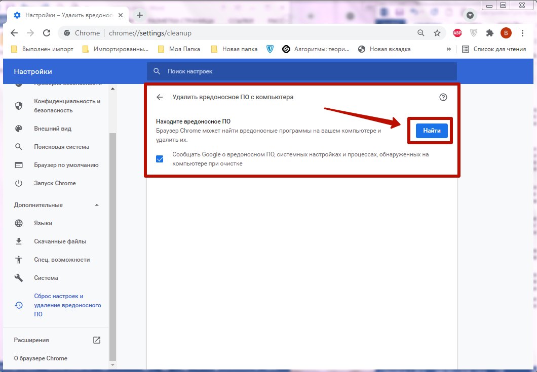 - Нажимаете на нее, и в самом конце будет раздел «Сброс настроек и удаление вредоносного ПО».
