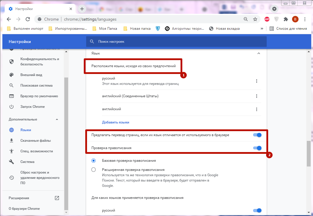 В этом разделе можно найти пункт для установки режима проверки правописания и указать список языков, для которых эта функция активна. Здесь же можно назначить основной язык браузера. Он определяется автоматически при установке на компьютер, но Вы имеете возможность изменить его на любой другой.