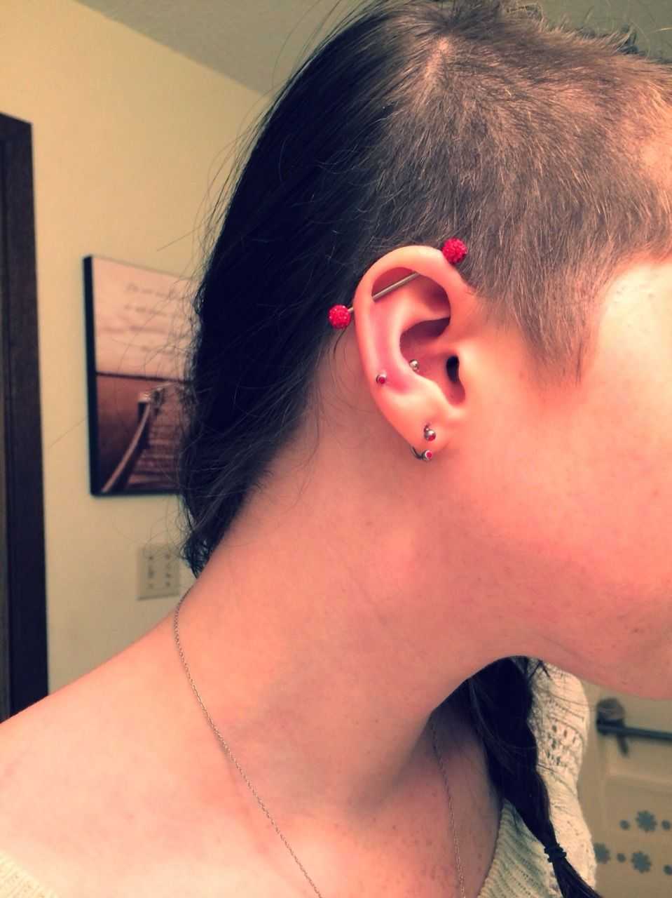 Индастриал пирсинг – вид прокола хрящевой части, предполагающий 2 обязательных отверстия на верхнем хряще, между ними вставляется серьга-штанга. Наиболее популярный вариант: одно отверстие спереди раковины, возле головы, второе – точно в противоположной точке.
