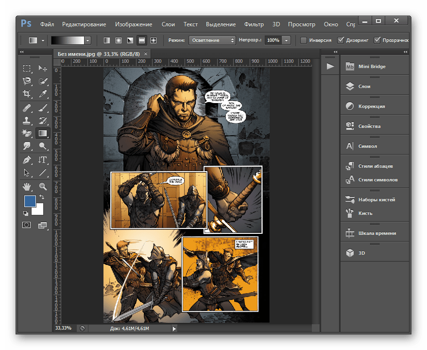 Специальных инструментов для создания комиксов в этой программе нет. Поэтому придется обойтись штатным функционалом.