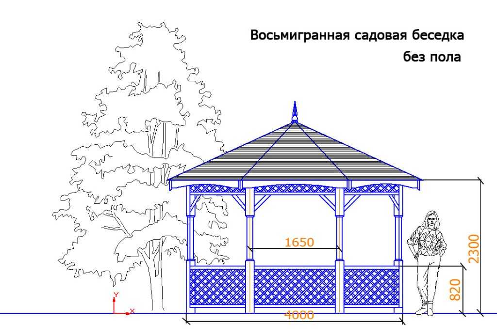 Чтобы у Вас получилась восьмигранная беседка своими руками, чертежи такой беседки являются острой необходимостью. Далее представлен подходящий чертеж такой беседки.