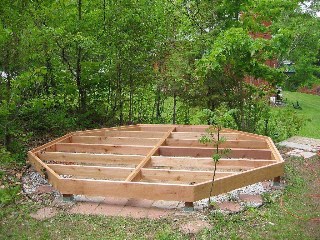 Собрав каркас периметра беседки, и установив его на опорные бруски, закрепите внутри него крестовину из спаренных досок и несколько параллельных им, установленных для большей прочности на ребро. Соединение деталей встык выполняйте так же с помощью саморезов, ввинчивая их под острым углом. Дополнительно усилить основание пола можно, используя стальные уголки.