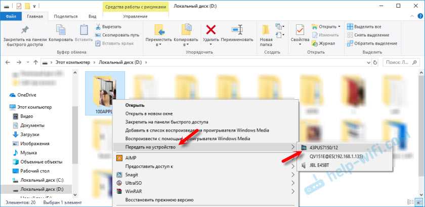 Все что необходимо сделать, это открыть на компьютере папку с нужными файлами, нажать правой кнопкой мыши на видеофайл, аудио, или фото и выбрать «Передать на устройство». В списке должен появится наш телевизор. Выбираем его.