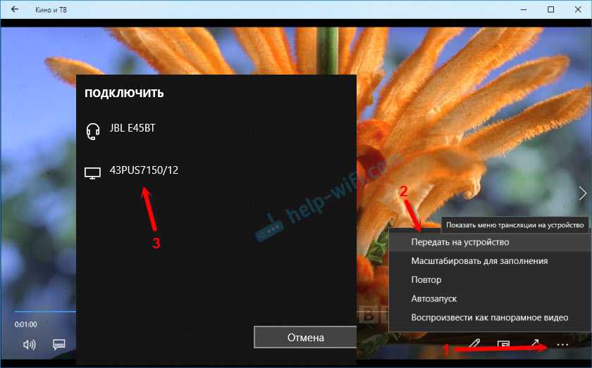 А если вы смотрите фильм через «Кино и ТВ» в Windows 10, то можно воспроизвести на ТВ сразу оттуда.