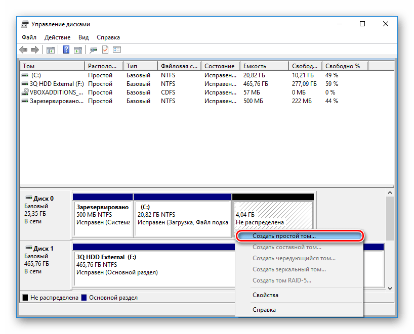 Если дисковая область черная и имеет статус «Не распределена», то вызовите контекстное меню ПКМ и выберите «Создать простой том».