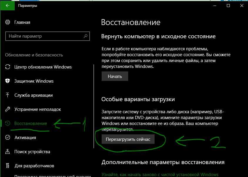 Откройте «Параметры» > «Обновление и безопасность» > «Восстановление» > и выберите справа в графе «Особые варианты загрузки» перезагрузить сейчас. Далее вы попадете в «Дополнительные параметры», где вам нужно запустить cmd (смотрите шаг 1).
