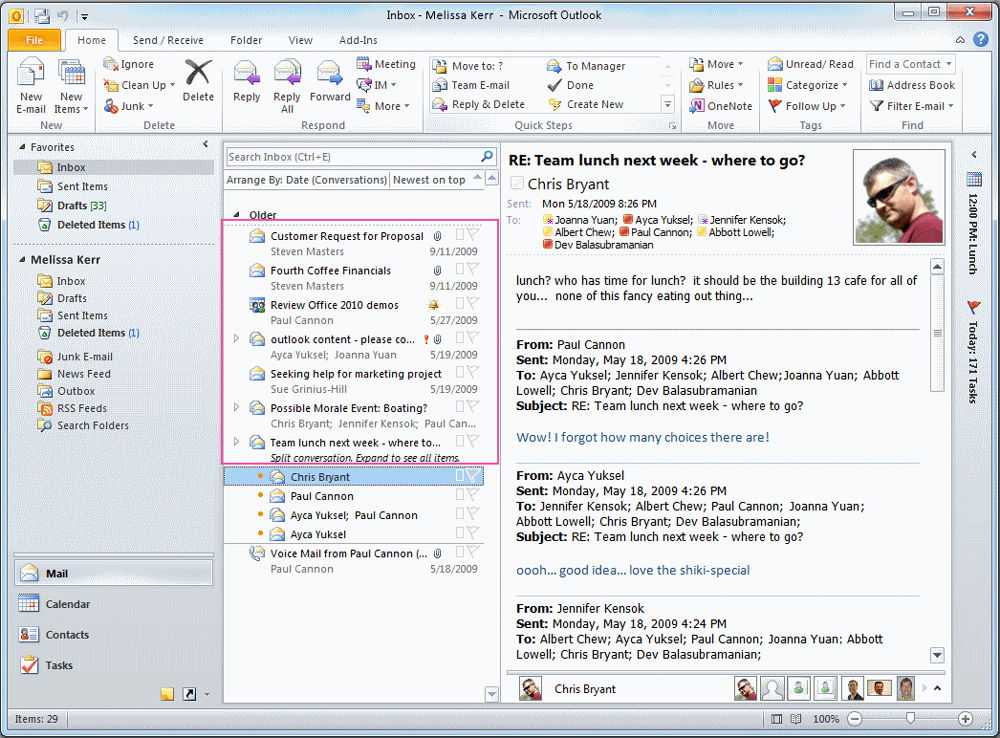 - На вкладке вид, в подменю «Расположение» жму на «Упорядочить», и далее в открывшемся меню, нажимаю на «Отображать в группах», по умолчанию отмечено, а снимаю для того, чтобы список сообщения не группировался по датам, а отображался как обычно.