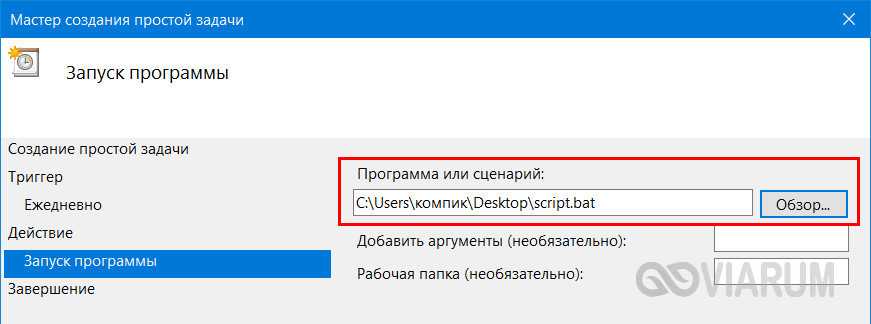 - В поле «Программа/скрипт» укажите путь к пакетному файлу.