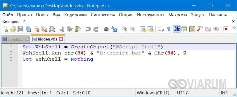 Если вы желаете полностью скрыть выполнение скрипта, можете воспользоваться «костылем» – скриптом VВS, который будет запускать ваш батник в скрытом режиме. Текст скрипта приведен ниже, сохраните его в файл hidden.vbs, предварительно заменив путь во второй строчке кода D:/sсript.bat путём к вашему батнику.