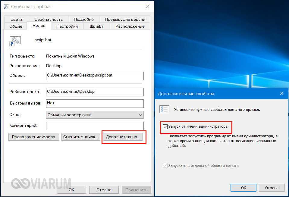 Кроме того, можно сделать так, что конкретный батник будет запускаться с повышенными привилегиями всегда. Для этого необходимо создать на такой скрипт обычный ярлык, открыть его свойства, нажать кнопку «Дополнительно» и отметить в открывшемся окошке галочкой пункт «Запуск от имени администратора». Этот способ хорош ещё тем, что позволяет выбрать для ярлыка любой значок, тогда как файл с расширением BAT или CMD всегда будет иметь невзрачный вид.