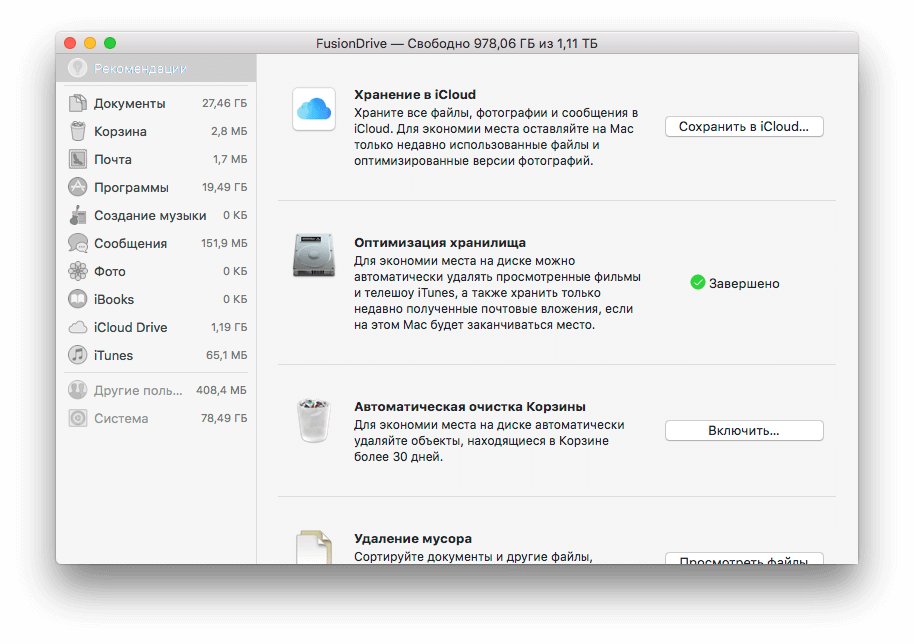 Вы окажетесь в разделе управления хранилищем. Но если раньше его функциональность была сильно ограничена, то с macOS High Sierra появилась возможность удалять отдельные разделы — от резервных копий и файлов iTunes до больших документов и почты. И все это в одном месте — да, прямо как в одном известном стороннем приложении. Причем перед этим система сама предложит вам необходимые рекомендации по сохранению накопителя в чистоте: например, включить автоматическую очистку корзины или оптимизировать хранилище.