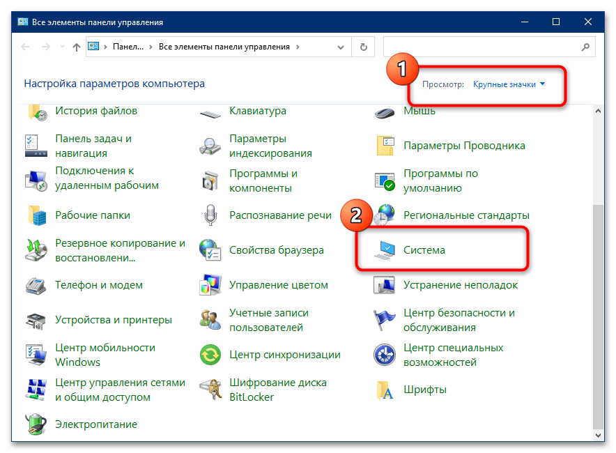 Переключите отображение в формат «Крупные значки» и воспользуйтесь пунктом «Система».