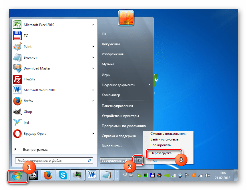 Теперь необходимо перезагрузить ПК. Жмите «Пуск». Затем щелкайте по треугольной фигуре справа от объекта «Завершение работы». В отобразившемся перечне выбирайте «Перезагрузка».