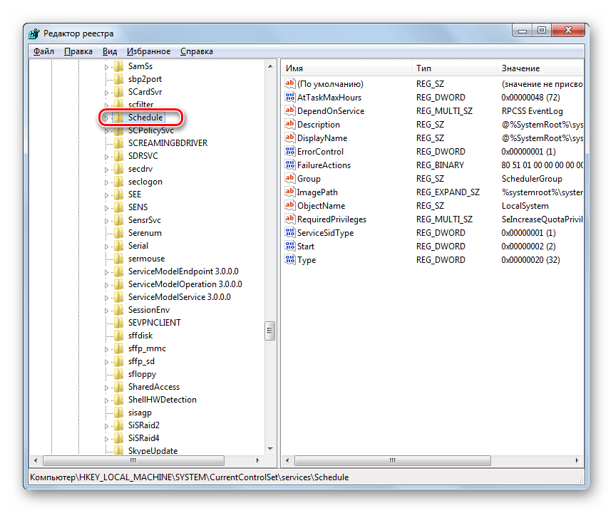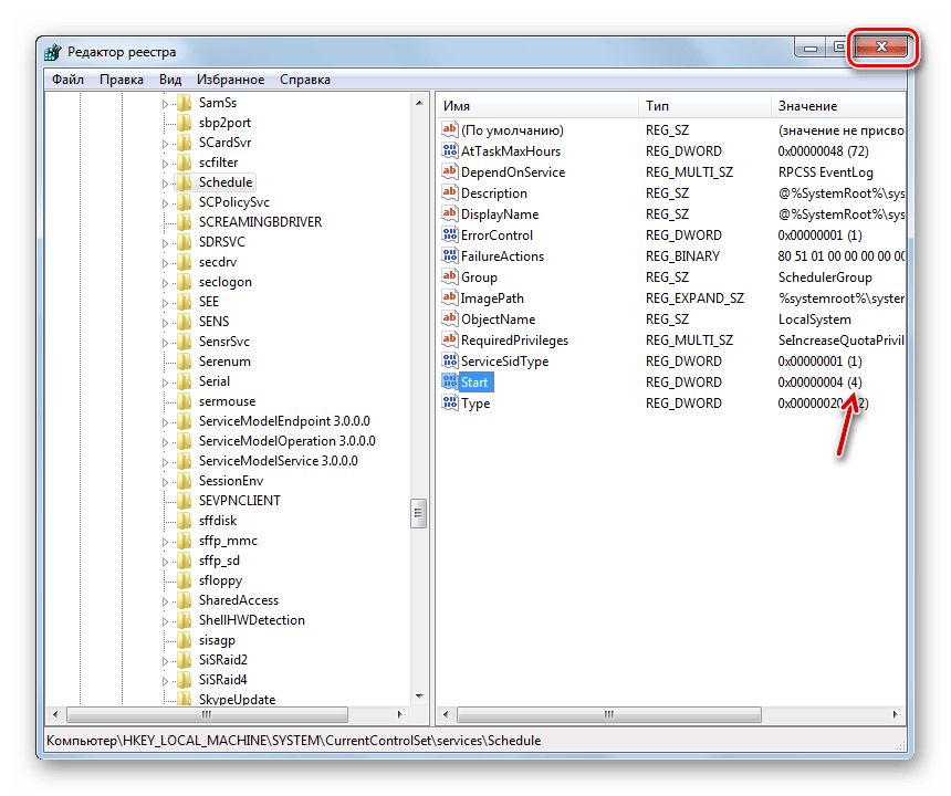 «Task Scheduler» крайне не рекомендуется отключать, так как в Виндовс 7, в отличие от XP и более ранних версий, он обслуживает целый ряд системных процессов. Поэтому деактивация «Планировщика» может привести к некорректной работе системы и ряду неприятных последствий. Именно по этой причине не предусмотрено стандартное отключение в «Диспетчере служб» той службы, которая отвечает за работу данного компонента ОС. Тем не менее в особых случаях временно требуется деактивировать «Task Scheduler». Это можно сделать путем манипуляций в системном реестре.