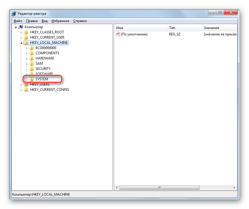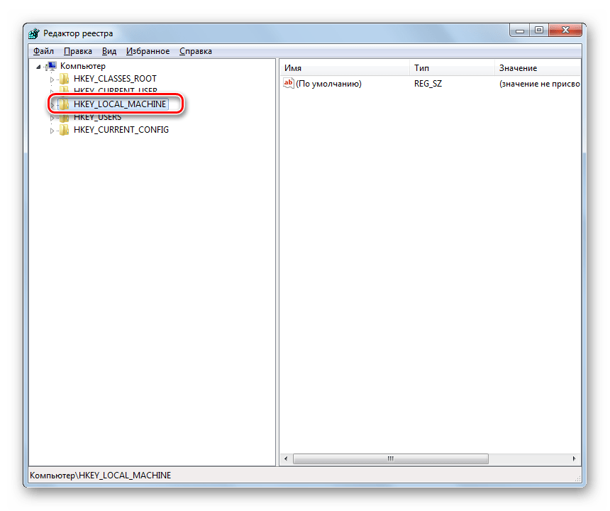 «Редактор реестра» активирован. В левой области его интерфейса жмите по наименованию раздела «HKEY_LOCAL_MACHINE».